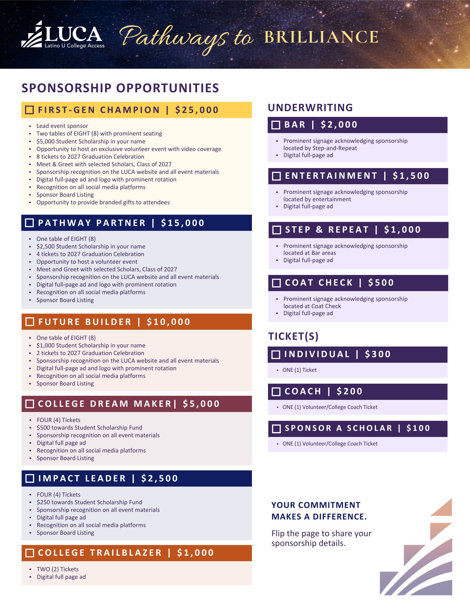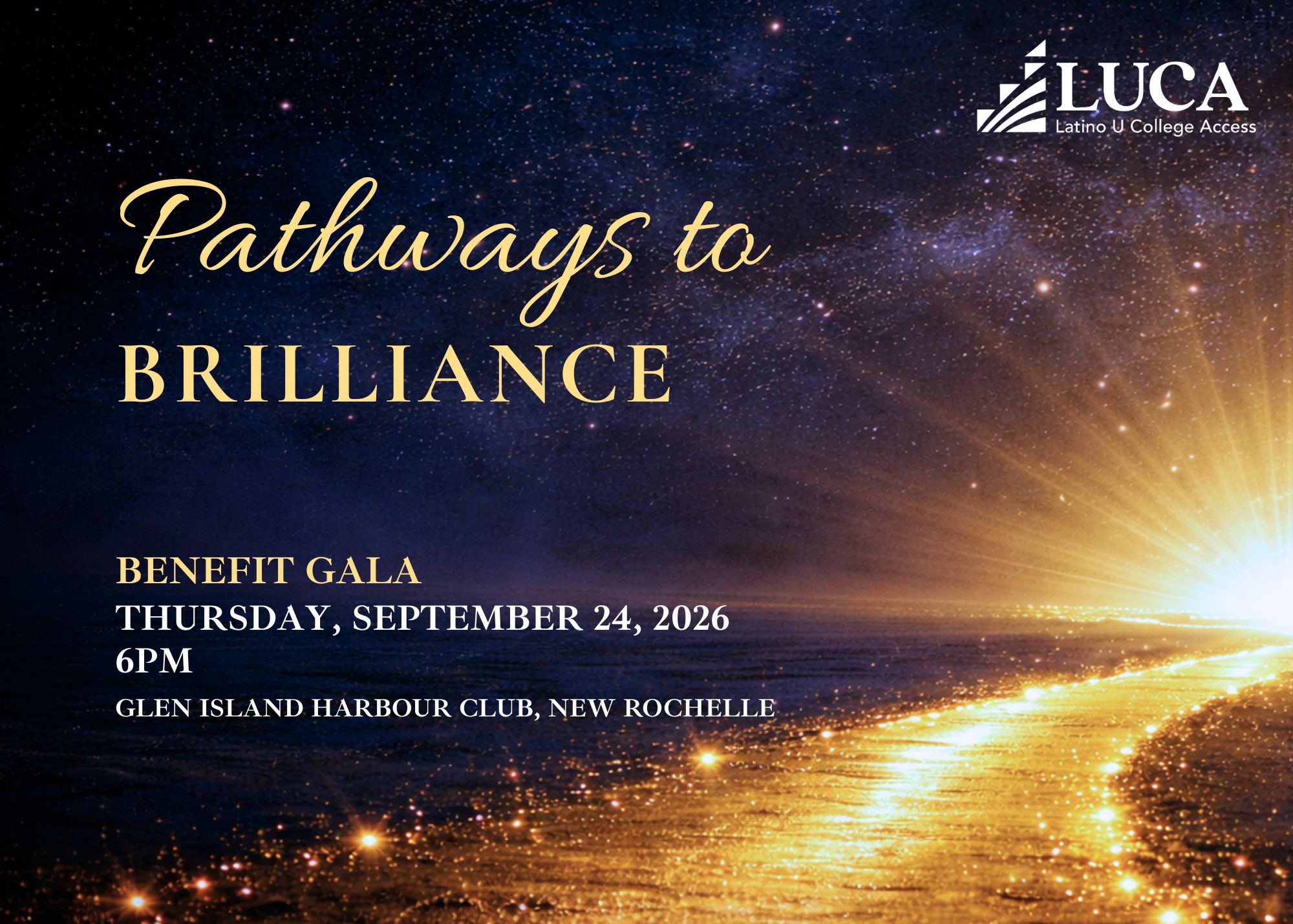 At Latino U College Access (LUCA), we believe every student with the drive to succeed deserves a pathway to higher education and a meaningful career. Join us for a night of inspiration, celebration and community at our 14th Annual Gala: Pathways to Brilliance as we celebrate the power of education and opportunity and the bright futures made possible through your belief and support.